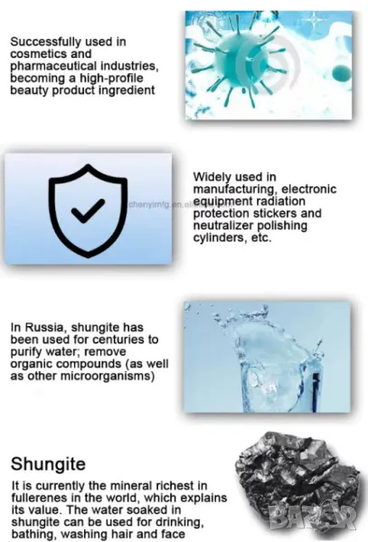 Доказано е, че шунгита неутрализира болестотворните зони и има благотворно въздействие върху здравето на хората. Шунгит може да се използва и за активиране на вода, която придобива мощни лечебни и козметични свойства.