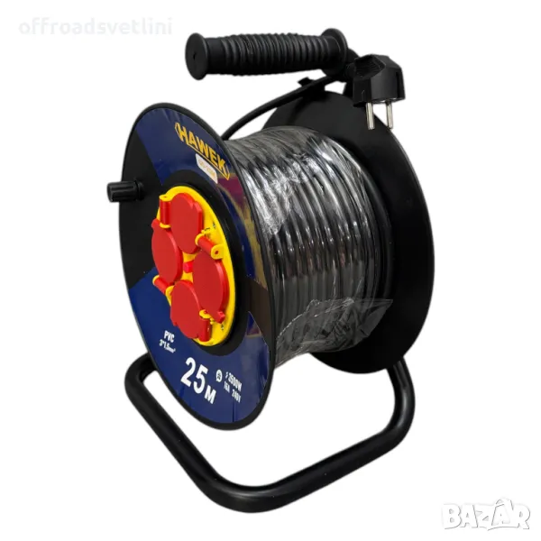 • Удължител на макара с кабел HAWEK има дължина на кабела 25 м, като напречното сечение на проводника е 3 x 1.5 мм². Подходяща е за захранване на няколко устройства едновременно. • Максималното натоварване на размотания кабел е 16 А. Ако се използва частично навит кабел, максималното натоварване се намалява до 4,5 А, поради индукцията на кабела.