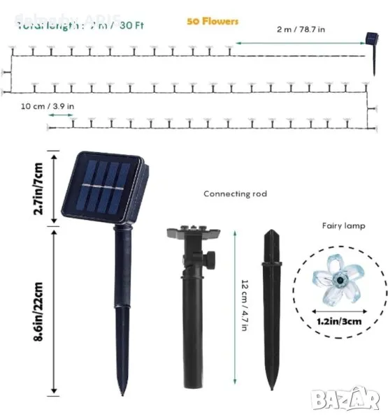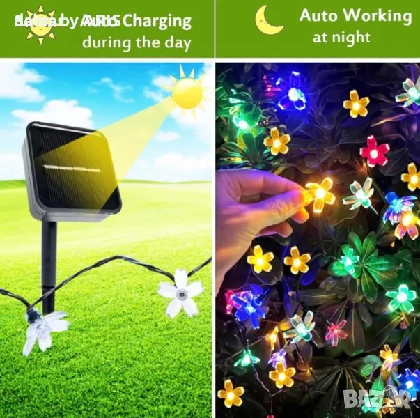 XRR Solar Fairy Lights, включващи 50 LED светлини с черешов цвят, обхващащи 7 метра, идеални за осветяване на градини, балкони, сватби, огради и др. С 8 режима на осветяване и водоустойчива конструкция, тези захранвани със слънчева енергия приказни светлини внасят чар и атмосфера във всяко външно пространство, което ги прави идеални за декорации през цялата година.