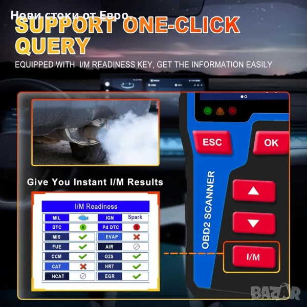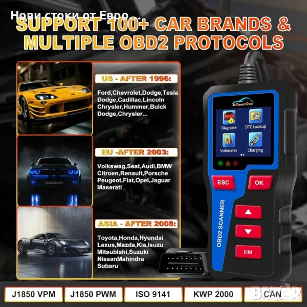 DonosHome OBD2 скенер Диагностичен четец на кодове за грешки Индикатор за нивото на батерията на двигателя Волтметър Freeze Frame Търсене на DTC O2 сензор I/M Система за тестване на готовност Започваща от 1996 г.Мощна функция: Нашият инструмент за диагностика на OBD2 скенер е намалена версия на преносим автомобилен скенер. Скенерът OBD2 предлага множество функции за диагностика и наблюдение на изправността на вашия автомобил. Някои ключови функции включват четене и изчистване на диагностични кодове за неизправности (DTC), проверка на потоци от данни на живо, показване на замразени изображения, тестване на O2 сензор, търсене на DTC и т.н. Ново подобрено OBD2: Нашият OBD2 четец на карти поддържа широк набор от диагностични функции, което го прави ценен инструмент за професионалисти и домашни майстори. Има дизайн на цветен екран и уникална светлинна лента, която ни позволява по-ясно да разберем състоянието на автомобила. Добавена функция за волтметър, индикатор за захранване на батерията и тест за стартиране на системата и др Точно откриване: Нашето диагностично устройство за скенер OBD2 може директно да генерира точни резултати. Той е проектиран да диагностицира бързо и точно проблеми с превозното средство и да предоставя данни в реално време, за да осигури ефективно отстраняване на неизправности и точен анализ. Той е оборудван с най-модерните индустриални чипове и има експлоатационен живот до 10 години. Можем да купуваме и използваме с увереност Тесен дизайн: Нашият OBD2 автомобилен скенер е проектиран да бъде съвместим с повечето модели автомобили. Все пак винаги се препоръчва да проверите спецификациите за съвместимост на продукта или да се консултирате с продавача, за да сте сигурни, че ще работи с вашия конкретен модел автомобил. Има 10 езикови режима, 5 бутона и кабел с дължина 65 см за по-добра връзка с автомобила