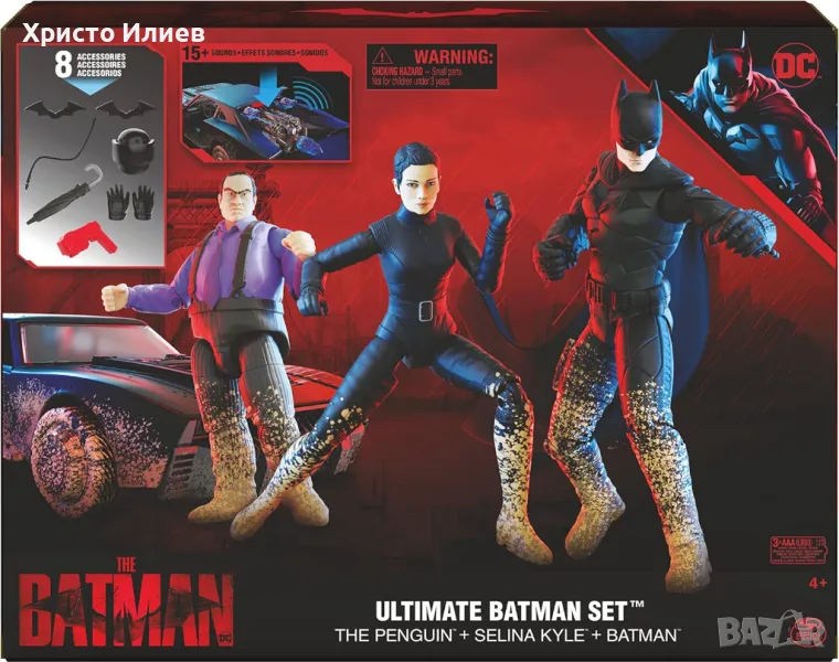- КОМПЛЕКТ ULTIMATE BATMAN: включващ три изключителни фигури на Батман и превозно средство Batmobile, комплектът Ultimate Batman има всичко необходимо, за да ангажирате въображението си и да създадете любимите си моменти от филма за Батман