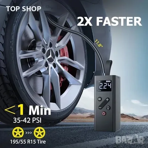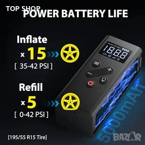 Мощност и Бързина: Максимално налягане 150 PSI, напомпва гума 195/55/R15 от 38 до 42 PSI за 1 минута.