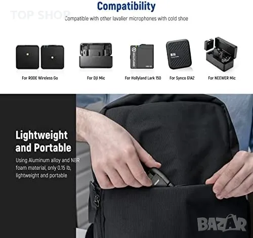 Съвместима с RODE Wireless Go Wireless Go II; Съвместима с DJI Mic; Съвместима с Hollyland Lark 150 Synco G1/A2; съвместима с SmallRig W60; съвместима с NEEWER CM22; съвместима със серията COMICA BoomX и други подобни професионални видео микрофони със студени обувки