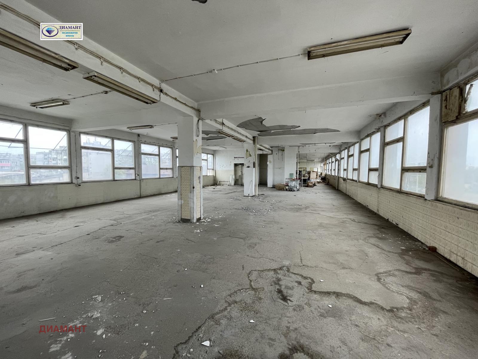 Самостоятелен етаж от промишлена сграда на комуникативно място, с идеални части от парцела, върху който е построена. Възможност за паркиране около сградата. Състои се от голяма зала със широчина 12 м. и колони по средата на залата през 6 м., два санитарни възела. Ползване на два товарни асансьора с рампа на кота нула и изходи в помещението, както и един пътнически асансьор на етажната площадка след съответен ремонт. Два санитарни възела. Състояние: под мозайка, дограма дървена, всичко е за основен ремонт. Възможност за предлагане на допълнителна квадратура на друг етаж. Реф. 6422.