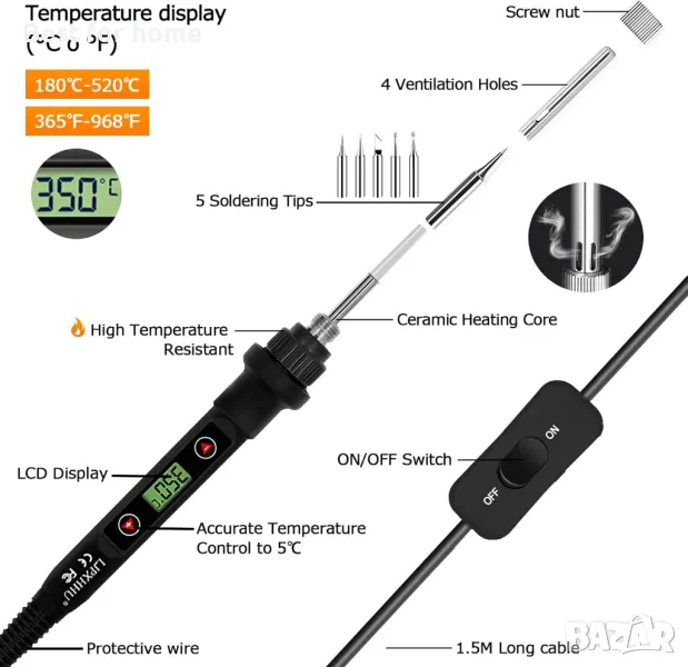 5 ℃ Прецизен контрол на температурата и превключвател за ВКЛ./ИЗКЛ.: С LCD екран с висока разделителна способност регулирайте по-широкия температурен диапазон (180 ℃-520 ℃/356 ℉-968 ℉) чрез бутоните +/-. ℃/℉ преобразуване. Хуманизираният ключ за включване/изключване на поялника го прави по-удобен за пестене на енергия и осигуряване на безопасно заваряване.