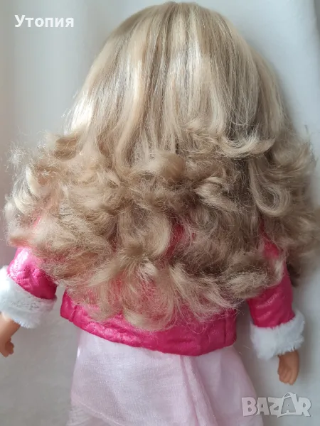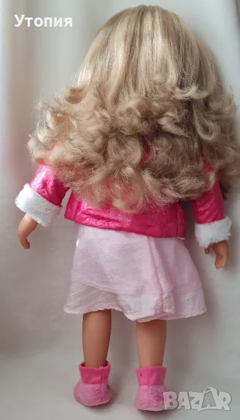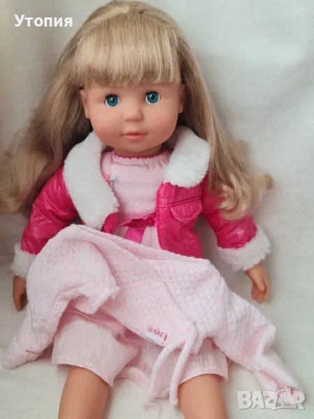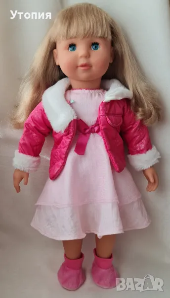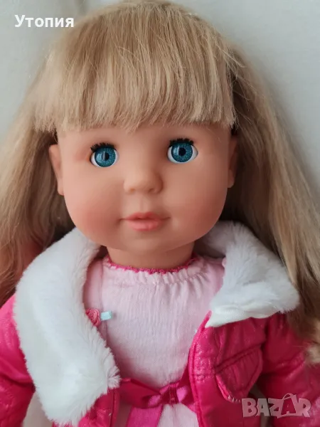 Голяма говореща кукла Мария Bayer Висока 45 см, с 5 скрити бутона, които активират голям набор от фрази на БЪЛГАРСКИ език. Тялото е меко, текстилно. Косата е отлично сресана и чиста. Очите са спящи. Три от бутоните са в тялото, два- в дланите. При леко натискане куклата говори. Повече от 100 фрази! Като подарък към куклата получавате красиво розово болеро. Облеклото включва рокля и яке. Цена: 27€