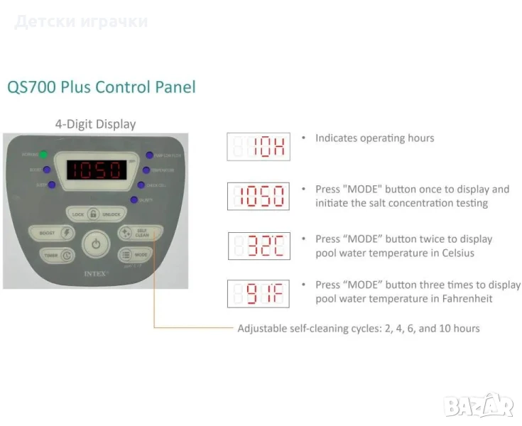 4. Включете системата за солена вода Krystal Clear®, натиснете бутона за захранване и изберете желания режим на самопочистване.