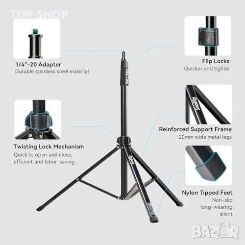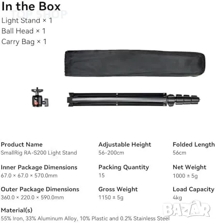 Портативност: Сгъваема светлинна стойка SmallRig RA-S200 с регулируема височина от 56 до 200см, лесна за транспортиране.