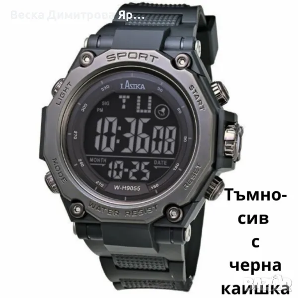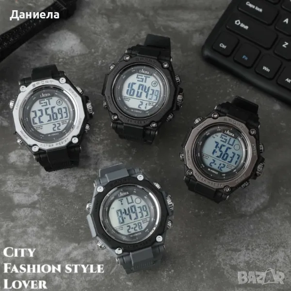 Механизъм: Дигитален;Показания: Час, минути, дата, ден от седмицата;Допълнителни функции: Хронометър, аларма, обратно броене, осветление;Водоустойчивост: 30 метра (WR 30M);Корпус: Здрав и лек;Бутони: MODE, START, RESET;Размер на дисплея: Големи цифри за лесно разчитане;Подходящ за: Спорт, тренировки, ежедневна употреба;Цветови комбинации: Черен с черна каишка/Сребрист с черна каишка/Черен със сива каишка/Тъмно сив с черна каишка;