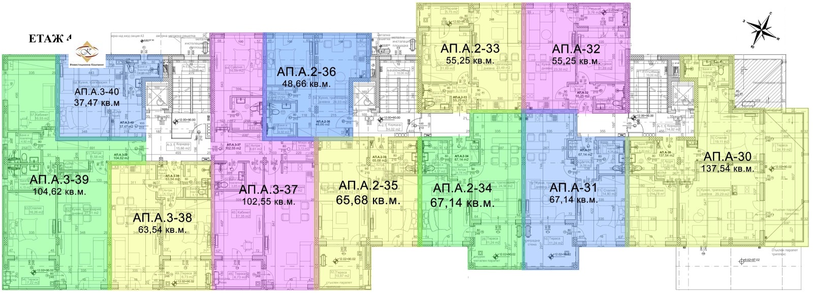 Апартамент A.-30 е с очарователна морска панорама , разположен е на четвърти етаж. Състои се от вх. антре, дневен тракт, две спални, две бани-тоалетни и тераса.
