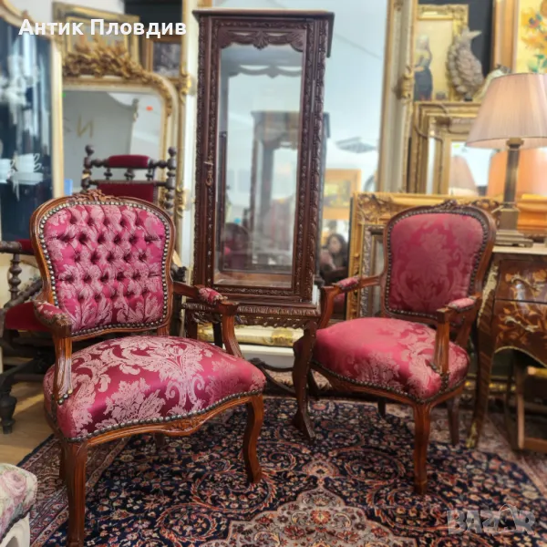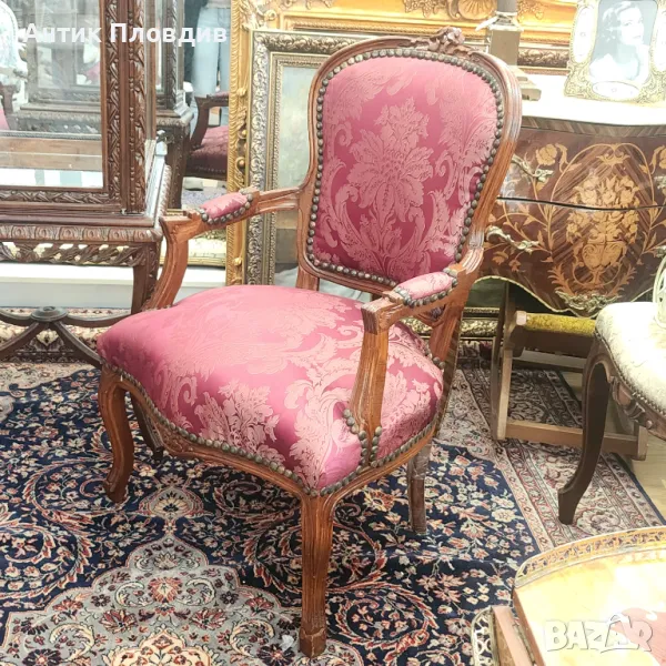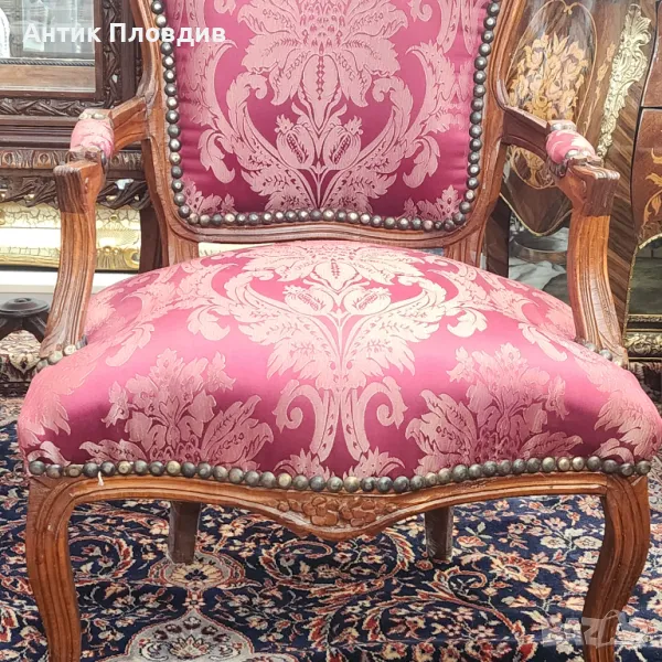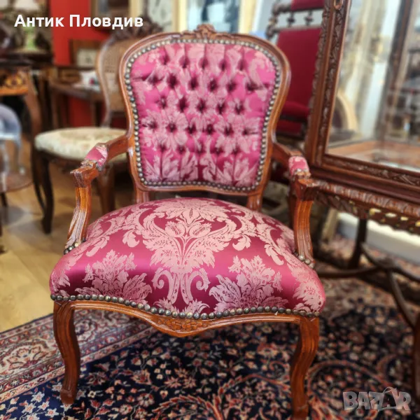 Дървената рамка е ръчно резбована, с плавни извивки и флорални елементи, подчертани от топлия цвят на дървото. Облегалката и седалката са тапицирани с луксозна дамаска в наситен малиново-розов цвят с класически бароков десен. Копчетата в стил капитоне и декоративните гвоздеи добавят допълнителен акцент към изтънчения облик на креслото.