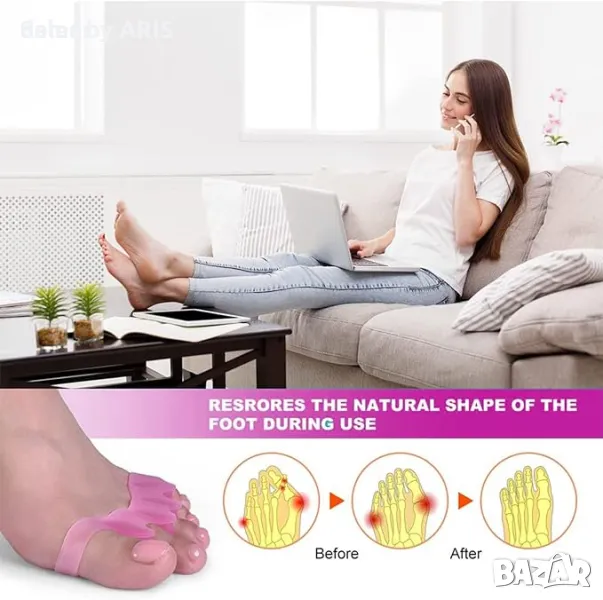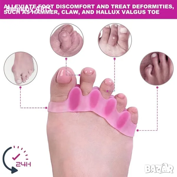 Гел разделителите за пръстите на краката са проектирани да оптимизират по научен начин пространството между пръстите на краката ви, нежно възстановявайки естествената им форма. Идеални за облекчаване на дискомфорта от буниони, чукчета на пръстите на краката и припокриване на пръстите на краката, тези сепаратори също противодействат на щетите от продължително носене на високи токчета или тесни обувки, като облекчават мускулното напрежение на пръстите на краката. При редовна употреба пръстите на краката ви постепенно ще се подредят в по-здраво състояние.Изработени от медицински гел без BPA, тези сепаратори са безопасни и удобни за продължително носене. Те могат да се перат и използват многократно, което гарантира дългосрочна употреба. Универсално проектирани да пасват на повечето мъже и жени, тези сепаратори са меки, еластични и се препоръчват от ортопедите като ефективни.