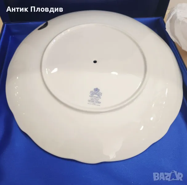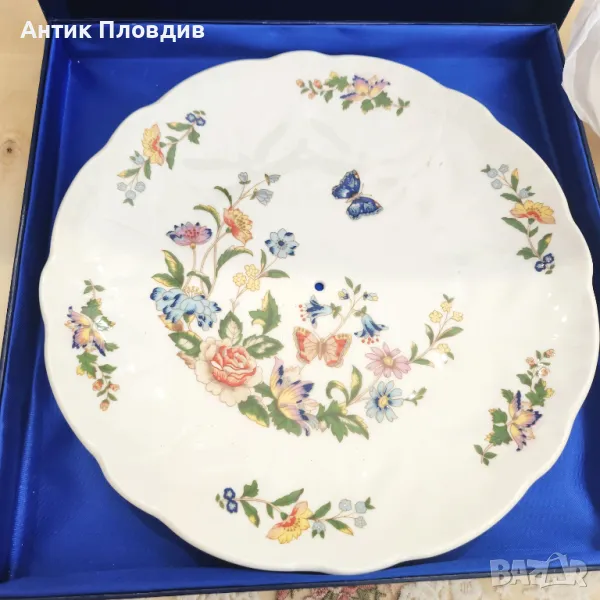 Изключително изискана порцеланова чиния за поднасяне от прочутата английска марка Aynsley, основана през 1775 г. Сервировъчната чиния е с типичното за марката качество – фина изработка, деликатна гланцирана глазура и богат флорален декор в нежни цветове. Централният мотив е допълнен с пеперуди и градински цветя, придаващи на изделието романтичен и класически характер.