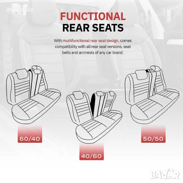 Калъфи за седалки за автомобили, предназначени за всички превозни средства, изработени от еластичен плат lakost, използвана от двете страни, с помощта на специална система за отливане, която покрива всички седалка.