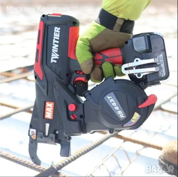 връзване на арматура MAX TWINTIER RB443T е с напрежение 14.4 V, капацитет на батерията 5 Ah и работи с тел, с диаметър ⌀ 1 мм. Машината има двоен механизъм за подаване на тел и прекарва 2 проводника наведнъж върху армировъчните пръти, като може да свързва арматура между 20 мм и 44 мм (т.е. между 2 x ⌀10 мм и 2 x ⌀22 мм). Зареждането на тел може да се извърши ръчно или полуавтоматично, без да е необходимо ръчно отваряне на подаващата предавка. Механизмът за огъване на телта на TwinTier прави по-къса височина на връзката, като така е нужно по-малко количество бетон за покриването и. Устройството е подходящо за работа с една ръка и намалява риска от професионални заболявания (китка и гръб). Използва се за връзване на железобетонна армировка в граждански и промишлени конструкции, магистрални конструкции, тунели, мостове, железопътни линии и сглобяеми стоманобетонни конструкции. Доставя се заедно с 2 броя батерии и зарядно устройство