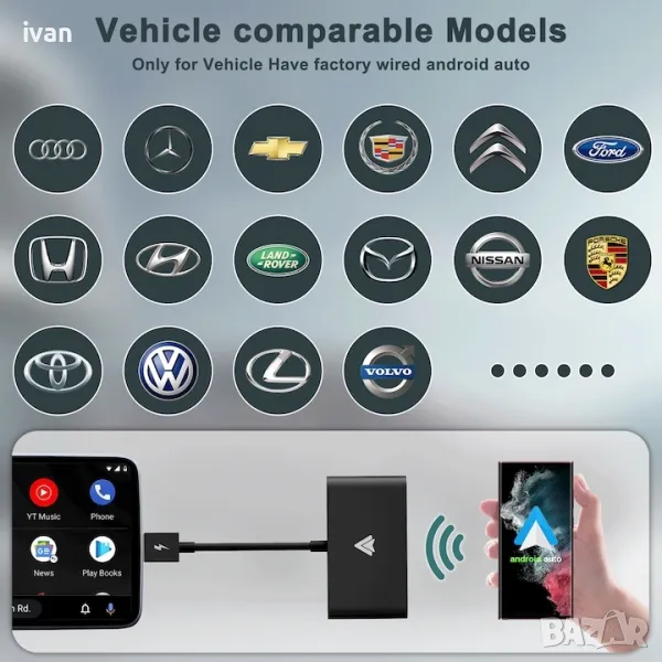 Забележка: Това описание е преведено автоматично на български език. Най-новият безжичен адаптер за кола с Android Безжичен адаптер за Android Auto Безжичният адаптер за Android Auto е много компактен и преносим, можете да използвате този безжичен адаптер за Android Auto, за да конвертирате лесно кабелния Android Auto в безжичен за ваше удобство. Важно: Android Auto не е наличен на устройства с Android (Go издание) Горещо напомняне: Телефоните Huawei, Xiaomi и Redmi не се поддържат, моля, потвърдете, преди да направите поръчка. Приемат се модели автомобили, оборудвани с Android Auto с кабел. (Ако колата може да използва кабелен Android Auto, тогава може да използва този безжичен адаптер за Android Auto.) Автоматично свързване Този безжичен Android адаптер за кола отнема само 5-15 секунди, за да се свърже бързо, а операцията е много проста. И след като завършите първото свързване, той ще се свърже автоматично, когато го използвате отново. (Топло напомняне: Поставили сме инструкциите за продукта в опаковката на продукта. Ако не знаете как да го използвате, можете да проверите инструкциите.) Plug and Play Функционалността "Plug and Play" на безжичния CarPlay адаптер за автомобил е изключително проста и удобна. Просто трябва да поставите адаптера в съответния порт на автомобила, да свържете телефона чрез Bluetooth и можете да започнете да използвате функциите на CarPlay, без да са необходими допълнителни настройки. Тази функция "Plug and Play" ви позволява бързо да се насладите на интелигентните функции на CarPlay, без да губите твърде много време за свързване и конфигуриране. (Пакетът включва подробно ръководство.) Забележка за съвместимост: Моля, уверете се, че колата ви поддържа кабел за Android Auto. Необходим е смартфон с Android, който поддържа най-новата функция на Android Auto. Изисква се Android 11 или по-нова версия на системата Android. Поддръжка на множество приложения Безжичният адаптер CarPlay позволява достъп и използване на широк набор от приложения в развлекателната система на автомобила. Сред тях са приложения за навигация, музикални плейъри, телефонни разговори и др., даващи ви възможност за лесен достъп до желаната от вас информация и забавление според вашите нужди. Наличен е оригиналният модул за управление на автомобила Чрез оригиналния режим за управление на автомобила можете да използвате безжичния адаптер CarPlay и в същото време да поддържате контрол върху оригиналната система за управление на автомобила. Това включва използването на оригиналните бутони, колела или сензорни екрани на автомобила, което ви позволява лесно да превключвате и използвате функциите на CarPlay, като същевременно запазвате контрол върху други функции на автомобила. По този начин ви предлагаме по-гъвкаво, удобно и безопасно автомобилно изживяване. Поддържайте модели автомобили с Android Auto чрез вграден кабел, моля, проверете преди покупка дали вашият модел автомобил е съвместим. Безжичното прожектиране е съвместимо с тези версии на Android: Всеки телефон с Android 11.0,Телефон на Google или Samsung с Android 10.0,Samsung Galaxy S8, Galaxy S8+ или Note 8 с Android 9.0. Въпроси и отговори: 1. Как да изтегля приложението Android Auto? Влезте в Google Play Store, изтеглете приложението Android Auto и го стартирайте винаги, когато сте на път. Изтеглете го тук. Като напомняне, телефони с Android 10 и по-нови версии не се нуждаят от приложението, за да работят с Android Auto. 2. Как да стартирам Android Auto на екрана на автомобила? За повечето съвместими автомоби