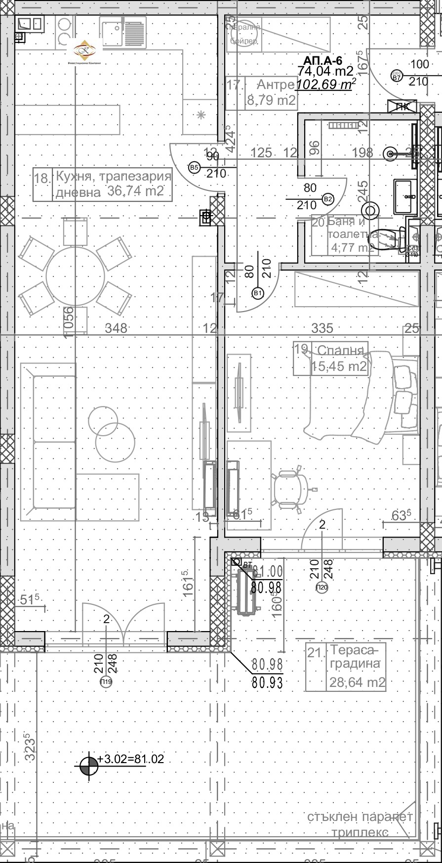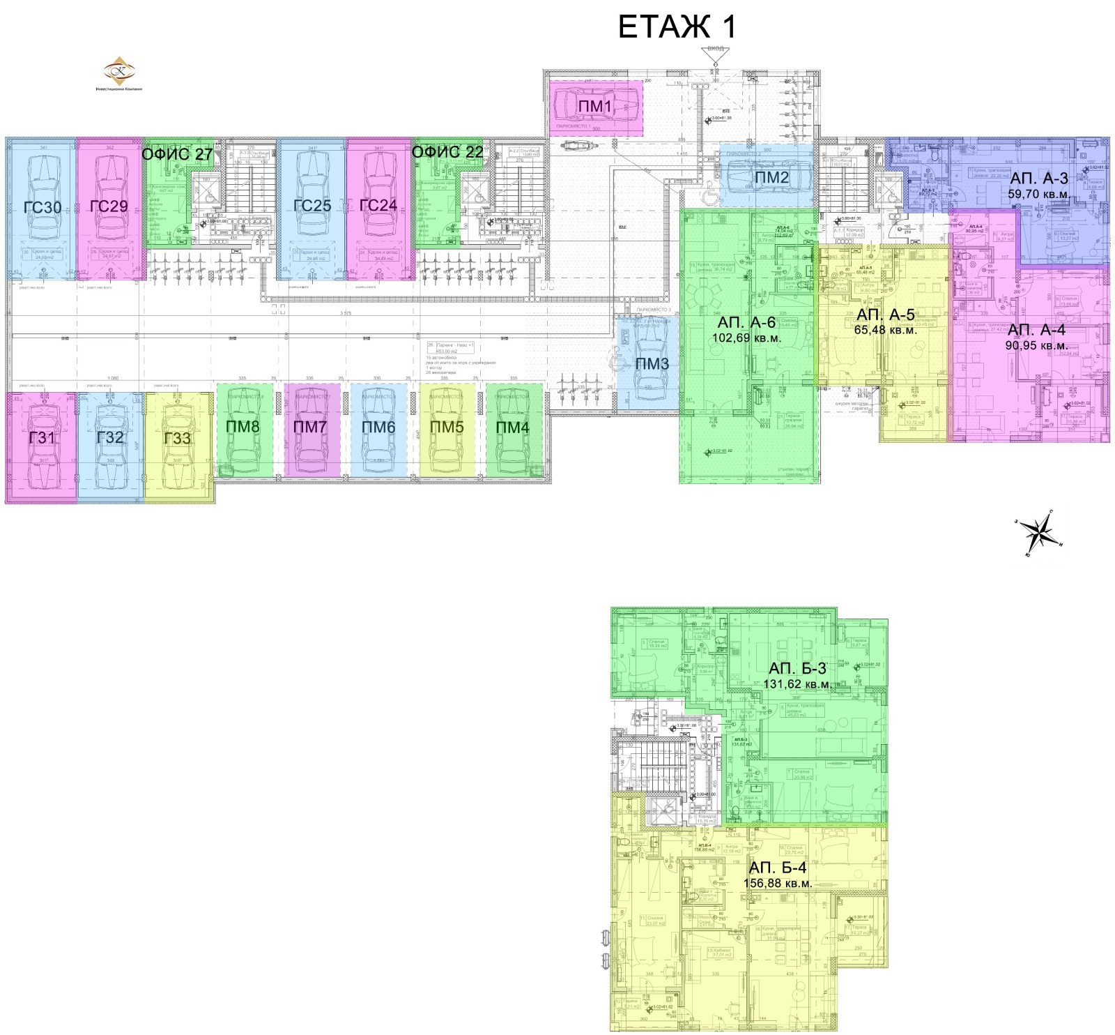 Апартамент A.-6 е двустаен, разположен е на първи етаж. Състои се от антре, дневен тракт, спалня,баня-тоалет и прекрасна тераса-градина.
