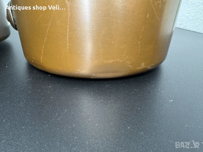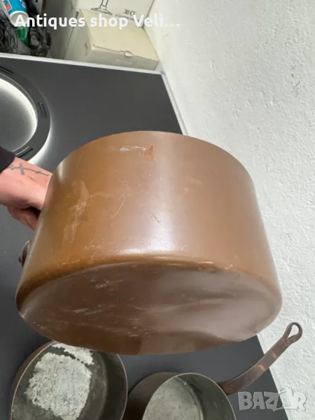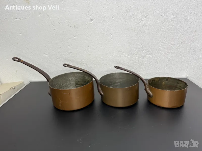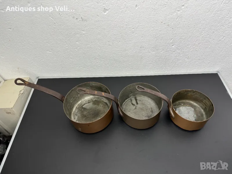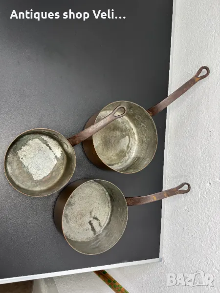 Комплект от 3 броя медни тигани с чугунену ръкохватки. Състоянието е видно от снимките. Предлагаме доставка с Еконт и лично предаване за градовете Велико Търново, Русе и Сливен!