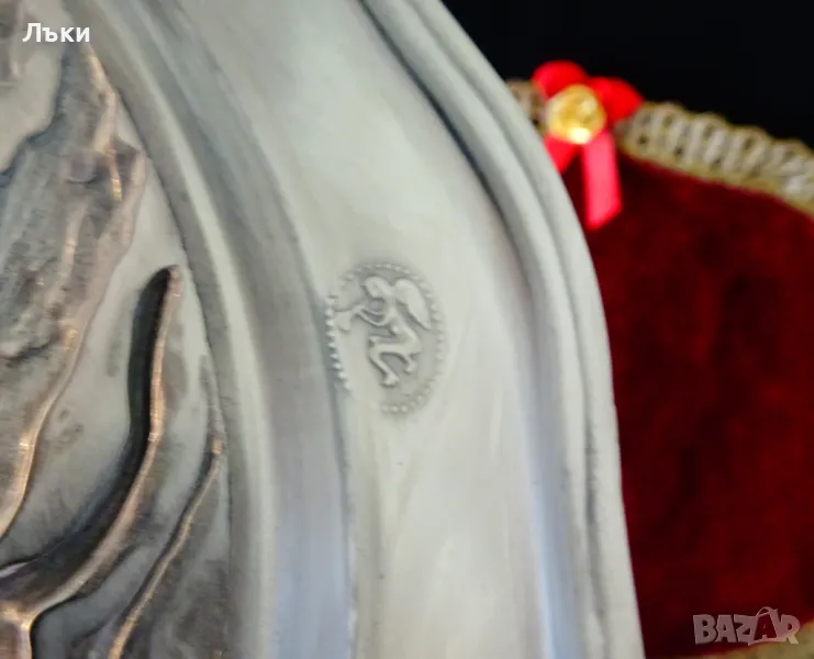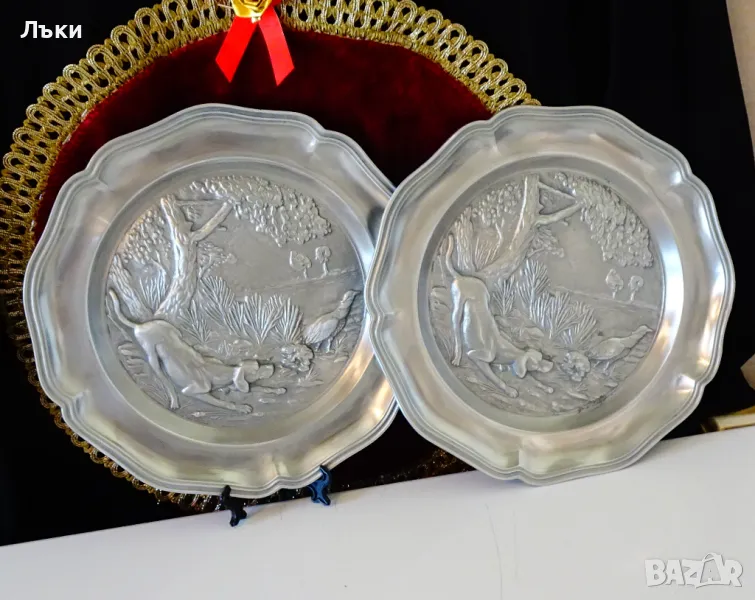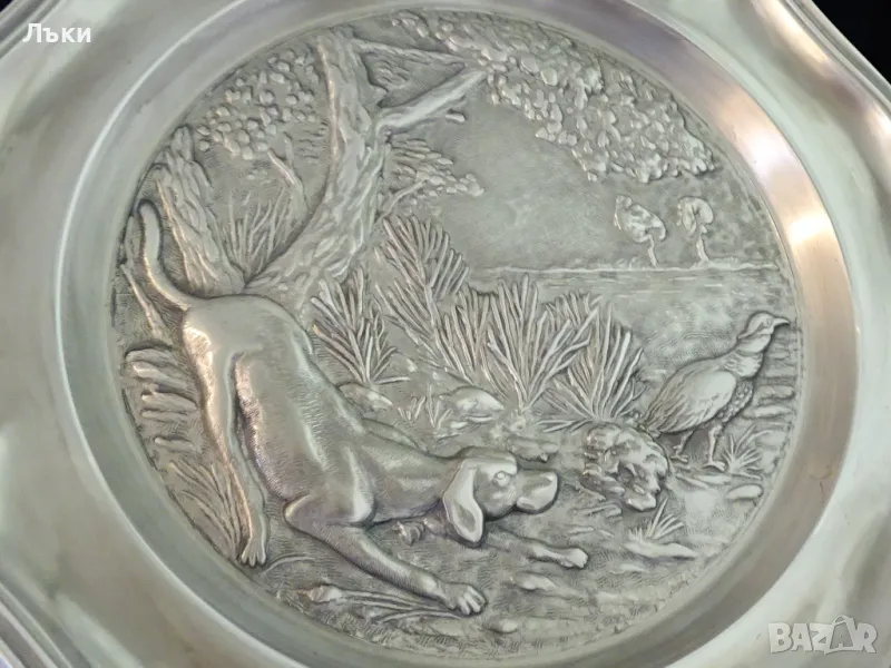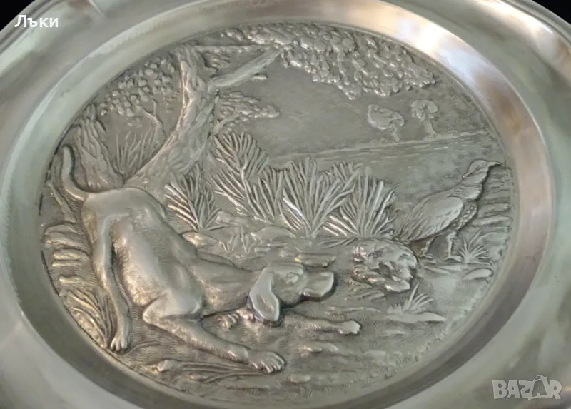 изработка от 95% калай и 5% сребро,маркирано от производителя.В центъра има прецизно изваяна релефна ловна картина – куче от ловна порода се готви за скок за да улови птица фазан на фона на красив горски пейзаж.Високо качество със