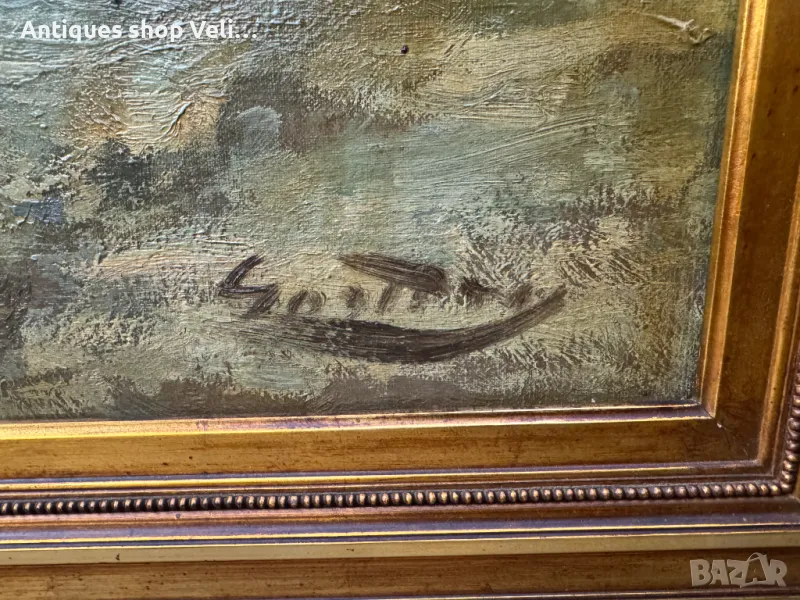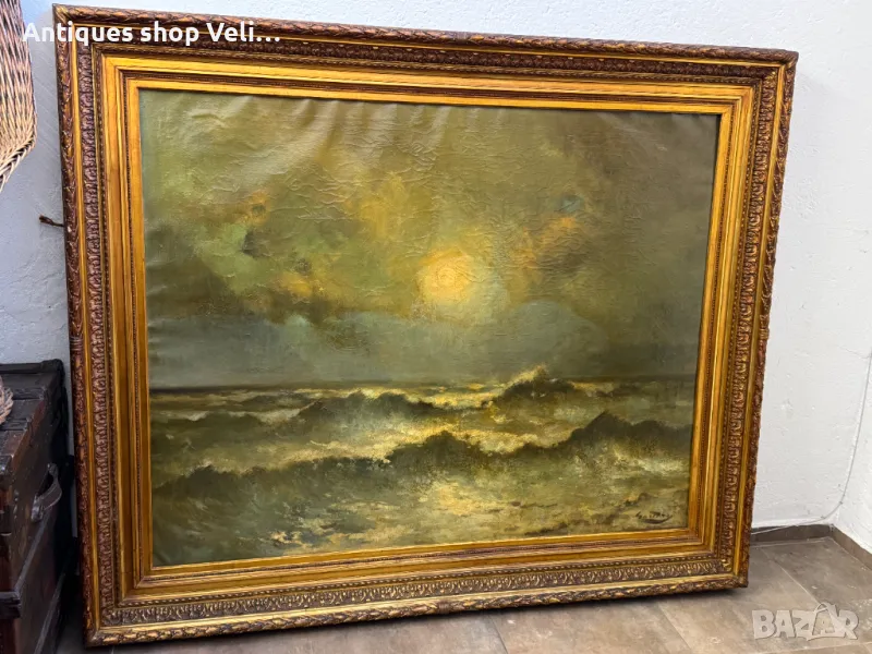 Много стара, но запазена авторска картина с внушителни размери, поставена в масивна дървена рамка. Добро състояние с малка забележка видна на снимките. Предлагаме доставка с Еконт и лично предаване за градовете Велико Търново, Русе и Сливен! Размери-170/141см.