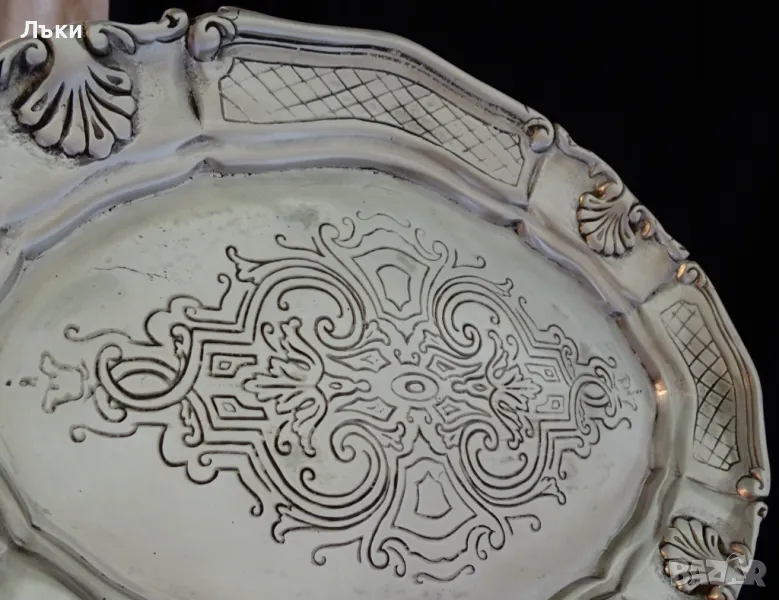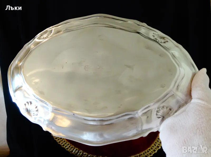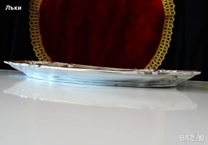 с ефектни орнаменти в стил Ар Нуво.Уникален съд за сервиране със сребърен блясък.Дължина 29 см.,ширина 20 см.,височина 3 см.,тегло 570 гр.