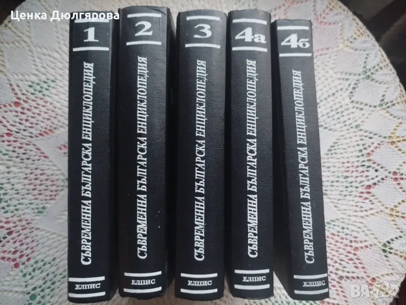 Съвременна българска енциклопедия в 5 тома - 1, 2, 3, 4а, 4б. С черно бели илюстрации. Издателство Елпис, година на издаване 1994-1995 г., твърди луксозни корици, 1 том.- 688 стр, 2 том.- 688 стр, 3 том.- 688 стр., 4а том - 608 стр, 4б том - 688 стр.