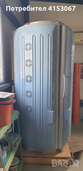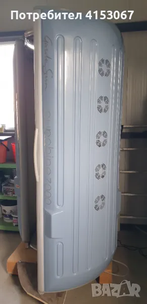 Виртикален Турбо Трифазен солариум. Перфектен. Работещ в момента заповядайте на слънце. Изключително ефективен и удобен. Без никаква забележка. Аз съм първи собственик. Купих го чисто нов от преставителството в Казанлък. Никога не е дефектирал и нищо не му е подменяно. Замених му веднъж лампите преди години и от тогава децата ми се пекат в него на ранчото като ми гостуват. Предполагам че нов такъв струва към 25000 лева. Една от снимките е информативна - всичко което интересува собственика му.