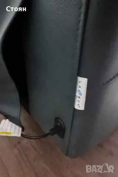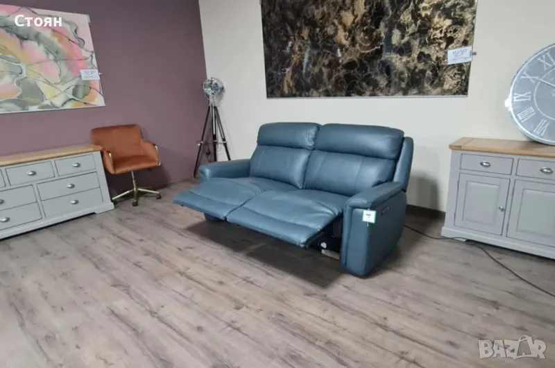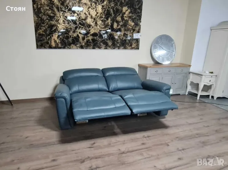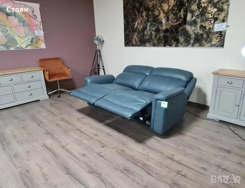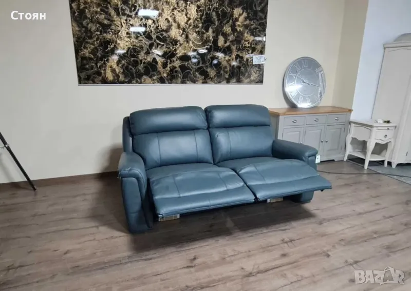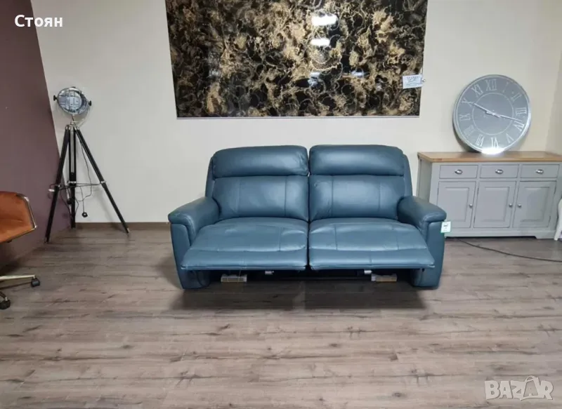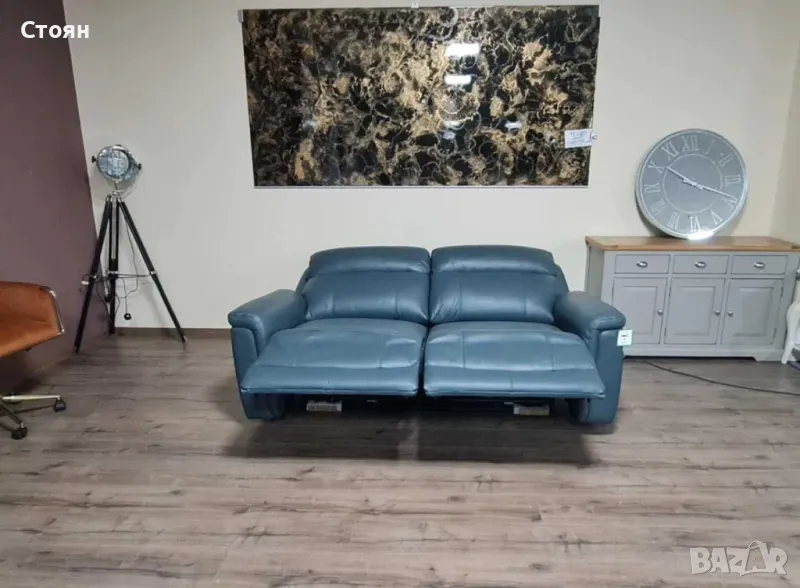 Тюркоазено син кожен диван тройка с ел. релакс механизъм La-z-boy → Обява 49936235