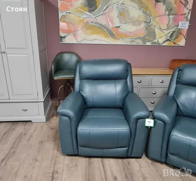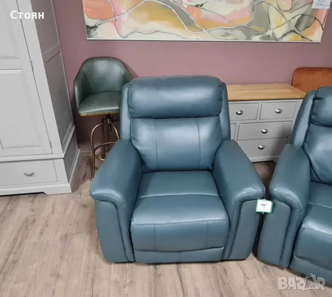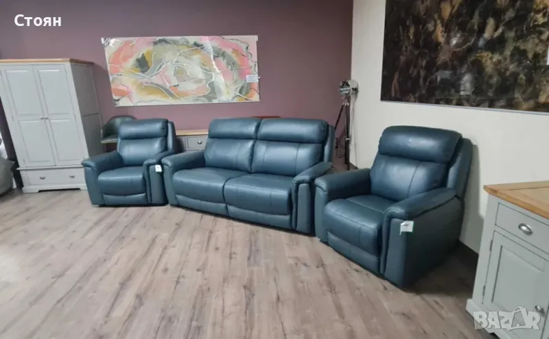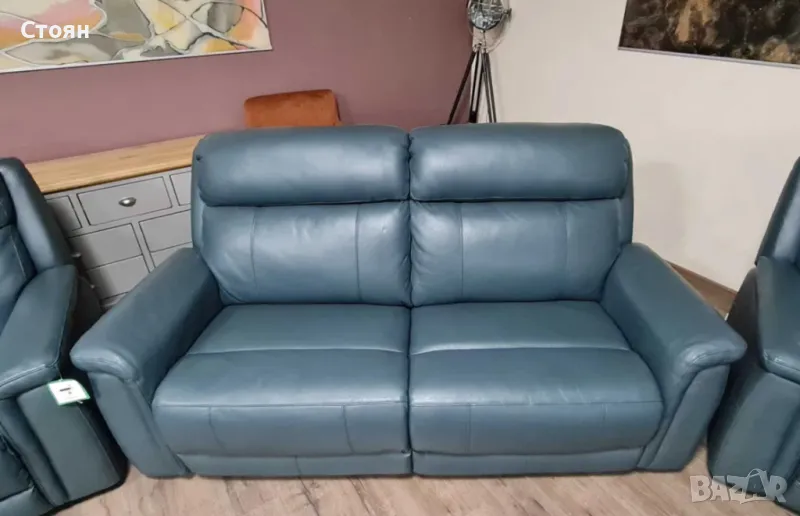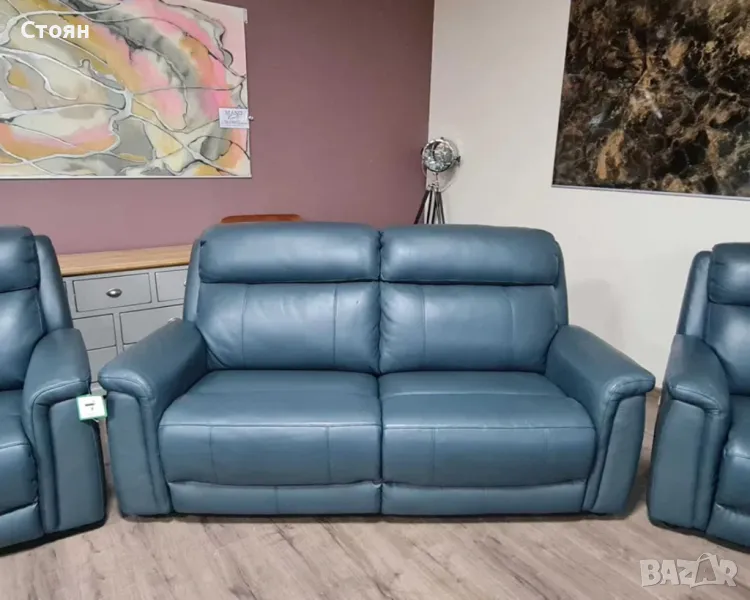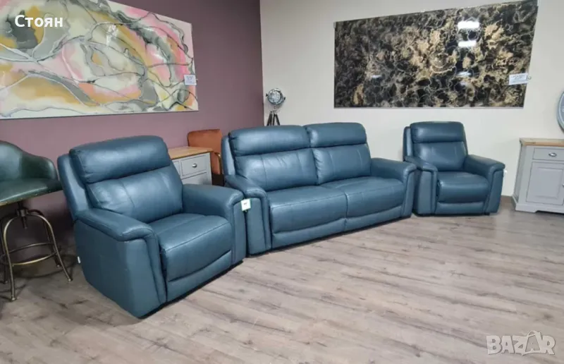 Тюркоазено син кожен комплект - диван тройка и два фотьойла La-z-boy → Обява 49936251