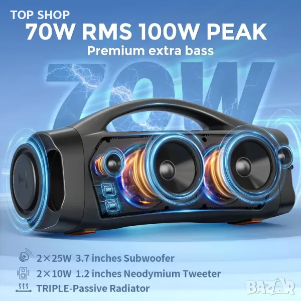 Bluetooth високоговорителят TMECTO разполага с 4 мощни драйвера (2 × 25 W субуфери, 2 × 10 W високоговорители) с усъвършенствана DSP технология и двойни пасивни басови радиатори за мощен бас и истински HD звук. Той поддържа TWS режим, позволяващ сдвояване на два високоговорителя за 140 W стерео съраунд изживяване, идеално за партита, филми или дейности на открито. Със стабилна Bluetooth връзка до 10 метра. Степента на водоустойчивост IPX7 гарантира издръжливост при всякакви метеорологични условия, а динамичното светлинно шоу, управлявано от ритъм, подобрява атмосферата на вашето парти с 8 режима на осветяване. Батерията от 10000 mAh осигурява до 20 часа игра и може да функционира и като захранваща банка. Допълнителните функции включват поддръжка на AUX-IN/USB и 15W бързо зареждане Type-C, което го прави идеален подарък за всеки повод.