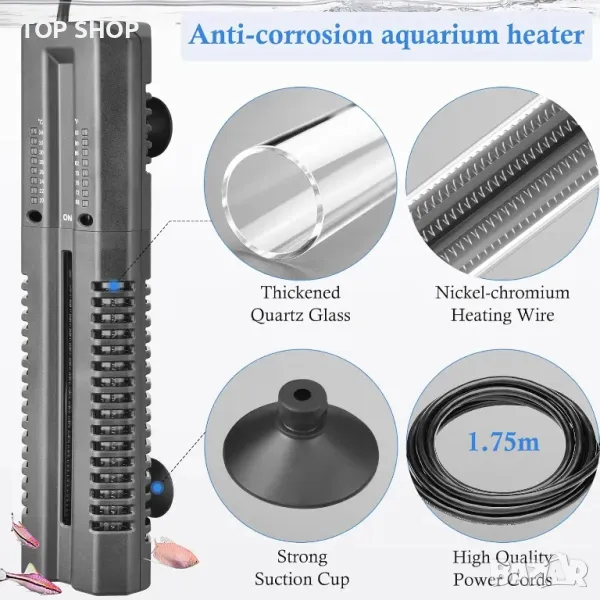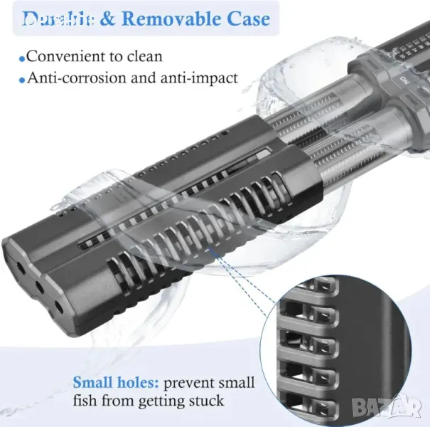 Този нагревател от кварцово стъкло с двойна тръба от 400 W осигурява бързо нагряване за резервоари с морска или сладка вода от 150-200 L. Външният температурен контролер позволява лесни настройки между 68-93 ℉, без да се намокри, включващ функция за памет за прекъсване на захранването. Издръжливият, подвижен капак на нагревателя предпазва както устройството, така и рибите, с устойчивост на корозия и удар. Двойните 2 mm удебелени кварцови тръби осигуряват стабилно, ефективно отопление, докато топлоустойчивият кварцов памук абсорбира ударите. Пакетът включва 1,75 м захранващ кабел, 5 вендузи и термометър за следене на температурата.