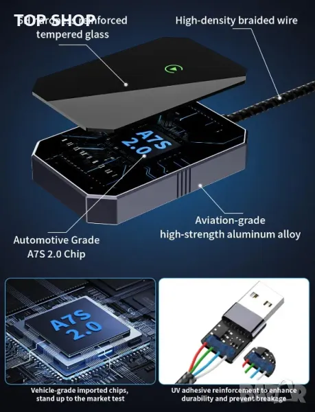 Преобразувайте своя кабелен CarPlay в безжичен без усилие с този plug-and-play адаптер. Той е съвместим с над 800 модела автомобили и iPhone 6 или по-нов (с iOS 10+).