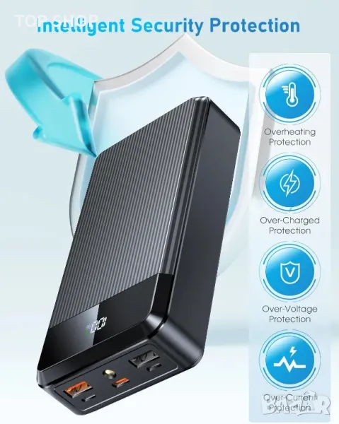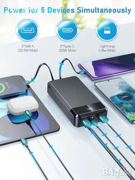Захранваща банка с голям капацитет, която може да зарежда смартфони 9-10 пъти и таблети 3-4 пъти, включваща издръжлива, устойчива на надраскване и прахоустойчива ABS обвивка със зърнесто покритие. Той предлага 22,5 W бързо зареждане чрез USB-C, захранвайки повечето устройства от 0% до 50% само за 30 минути. Оборудван с 3 входни порта (Micro USB, Lightning, Type-C) и 5 изходни опции, той поддържа гъвкава съвместимост с устройства и настройки за бързо зареждане. LED дисплеят показва оставащия капацитет, докато усъвършенстваните функции за безопасност предпазват от презареждане, прекомерно разреждане и късо съединение, осигурявайки дълготрайна и надеждна работа.