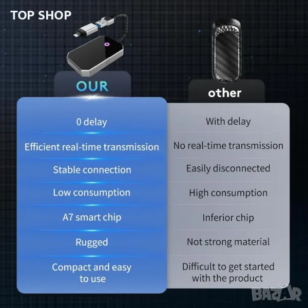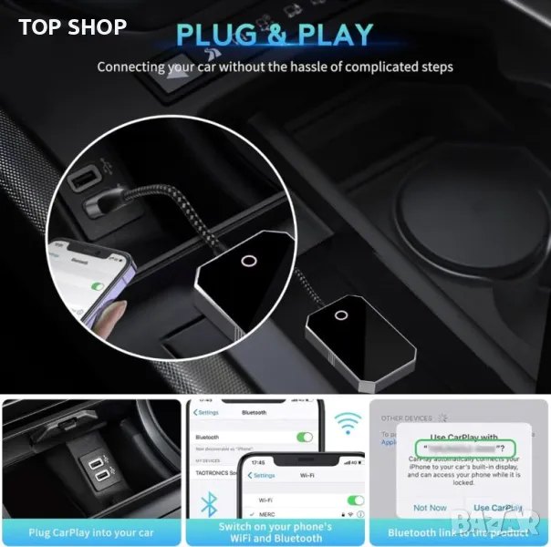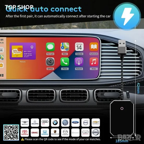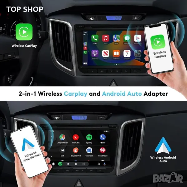 Безжичният адаптер 2-в-1 CarPlay трансформира кабелните CarPlay и Android Auto в безжична връзка, като поддържа функции като навигация, музика, гласов асистент и разговори без кабели. Съвместим е с над 800 модела автомобили и поддържа iPhone 6 и по-нови, както и повечето телефони с Android. Проектиран за автомобили с кабелен CarPlay и Android Auto, той предлага универсална съвместимост. Елегантният, компактен и издръжлив дизайн включва здрава външна част и дълготраен плетен кабел. Малкият му размер позволява лесно прикриване, повишавайки безопасността и удобството при шофиране. Адаптерът осигурява напълно автоматично изживяване при шофиране, свързвайки се без усилие чрез вграден 5GHz WIFI модул за плавна, стабилна връзка, поддържаща гласов контрол, функции на волана, сензорен екран и операции с бутони.