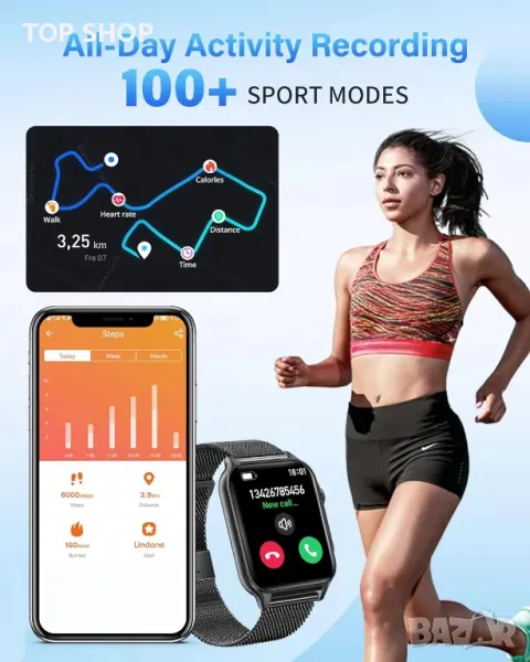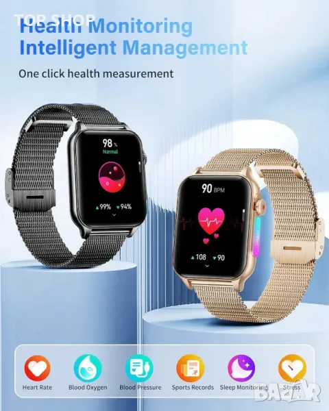 часовник включва усъвършенствано наблюдение на здравето със сърдечен ритъм, кислород в кръвта (SpO2) и проследяване на съня, заедно с изгаряне на калории и проследяване на стъпките. Той поддържа обаждания, SMS и известия за популярни приложения и включва вграден високоговорител за повиквания, музика и предупреждения. Съвместим с повечето устройства с Android и iOS, той идва с две взаимозаменяеми каишки (метална и силиконова) за различни стилове. С над 100 спортни режима, водоустойчивост (IP67) и функции като контрол на музиката, актуализации за времето, контрол на камерата и напомняния за заседнал живот, той осигурява гъвкаво изживяване. Дълготрайна батерия поддържа 3–7 дни употреба, подобрявайки удобството и интегрирането в начина на живот.