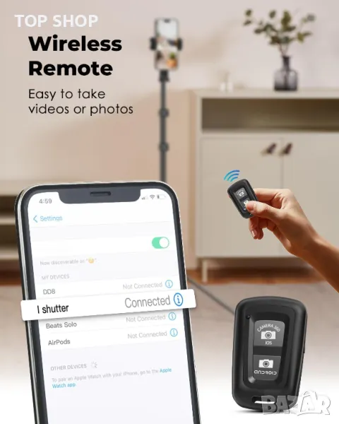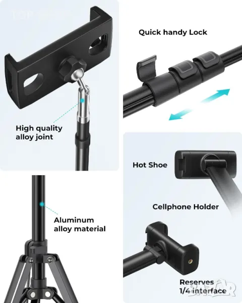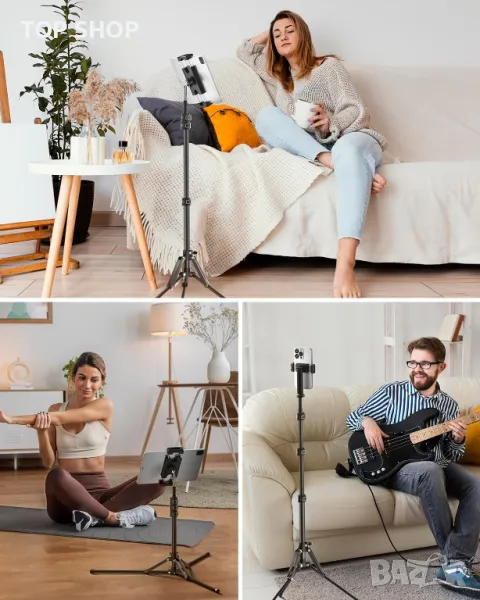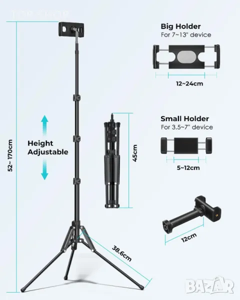 стойка за мобилен телефон и таблет, съвместима с устройства от 3,5 до 13 инча, включително популярни модели като iPad Pro, iPhone, Kindle и Galaxy Tab. Тя разполага с 2.4G безжично дистанционно за безпроблемна връзка до 10 метра, идеално за селфита, групови снимки, заснемане и видеоблог. Регулируемият статив стои на височина от 51 до 170 см, предлагайки стабилност за фотографи, влогъри и стриймъри на живо. Лесно сгъваем и компактен, той е идеален за употреба в движение, тежащ само 770 грама. Изработена от първокласна алуминиева сплав, тази стойка гарантира издръжливост и надеждна опора за вашите устройства, което я прави задължителна за всяка настройка.