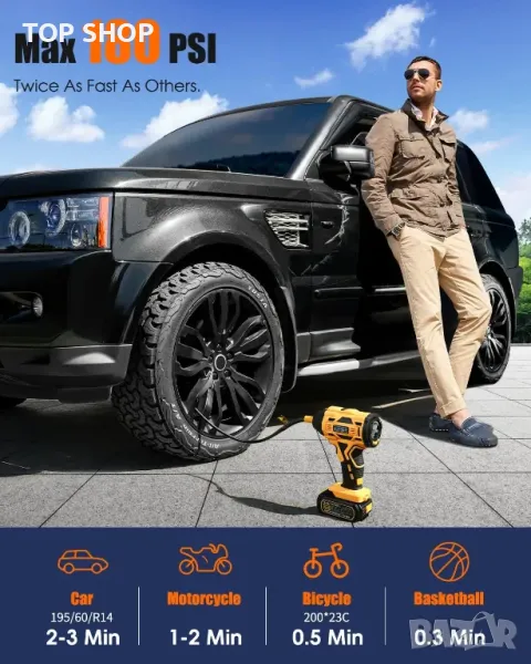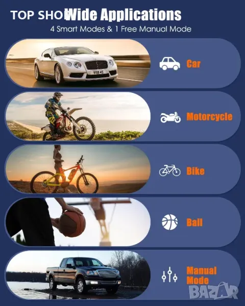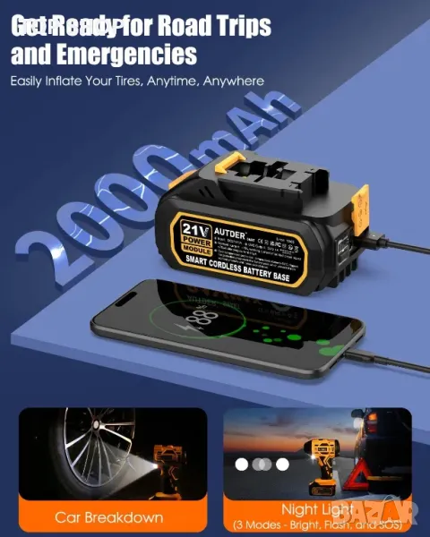 помпа за гуми AUTDER AD380 предлага бързо помпане с максимално налягане от 180 PSI, помпане на гума 195/55/R16 за 2,5 минути, захранвано от 21V батерия, която се зарежда напълно за 2 часа. Лек 1,36 килограма, лесен за носене и работа с цифров дисплей, автоматично изключване и функции за безопасност като охлаждащи вентилатори и LED светлина с SOS режим. Универсален за помпане на гуми, топки и играчки, включва пълен комплект аксесоари, чанта за съхранение. Проектиран за безопасна и ефективна употреба, той е идеален за домашни и външни нужди. Важни бележки: За да поддържате живота на батерията, избягвайте да съхранявате помпата във влажни условия. Използвайте предоставения захранващ адаптер, за да заредите батерията директно, тъй като зареждането чрез 12V DC кабел може да повреди батерията. 12V DC кабелът за кола е предназначен само за спешна употреба, като захранва устройството през запалката на автомобила.
