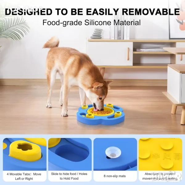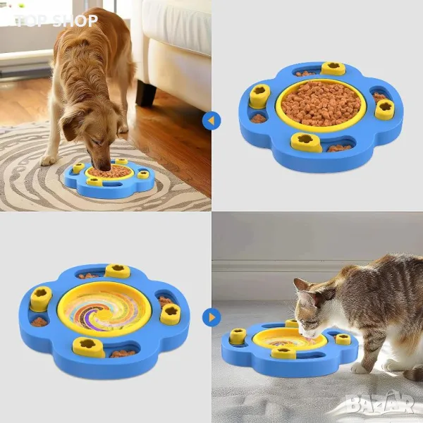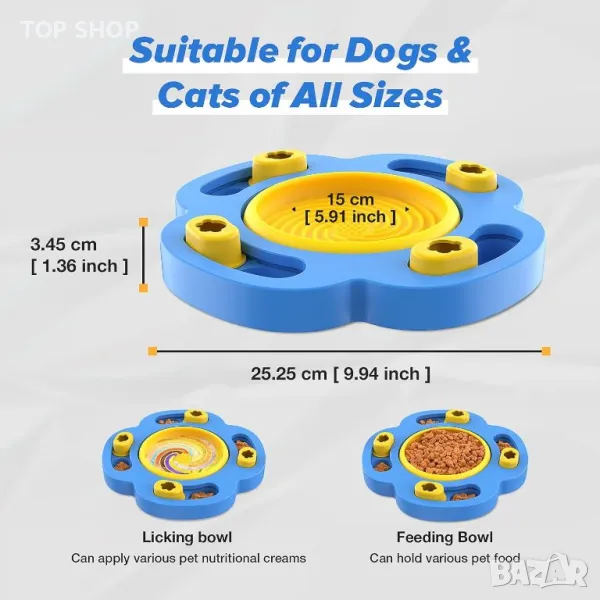 Купата за кучета Slow Feeder Dog Bowl е проектирана да удължава времето за хранене до 8 пъти, като помага за предотвратяване на задушаване, повръщане, подуване на корема и лошо храносмилане, като насърчава по-бавното хранене и подобрява храносмилането. Тази купа разполага с множество силиконови вендузи на дъното, за да я закрепят здраво към гладки повърхности, намалявайки разливането и движението по време на хранене. Диаметърът му е 17 см с височина 2,5 см и е изработен с оптимална ширина и дълбочина, за да побере хранителни кремове и сосове. Освен това включва четири скрити отделения за суха храна, насърчавайки умствената стимулация, докато кучетата се учат да извличат храна чрез плъзгане на капака. Изработен от хранителен ABS и силикон, той не съдържа вредни химикали като BPA, PVC и фталати, осигуряващи безопасност за вашия домашен любимец. Тази купа е подходяща както за суха, така и за мокра храна и се почиства лесно, може да се мие в съдомиялна машина и е проектирана с гладка повърхност, за да минимизира задържането на мръсотия и миризми.