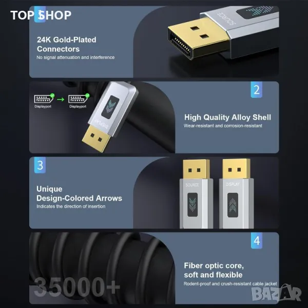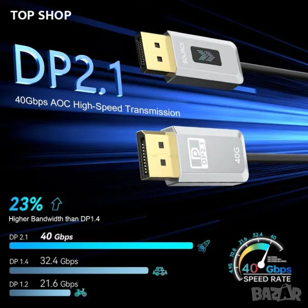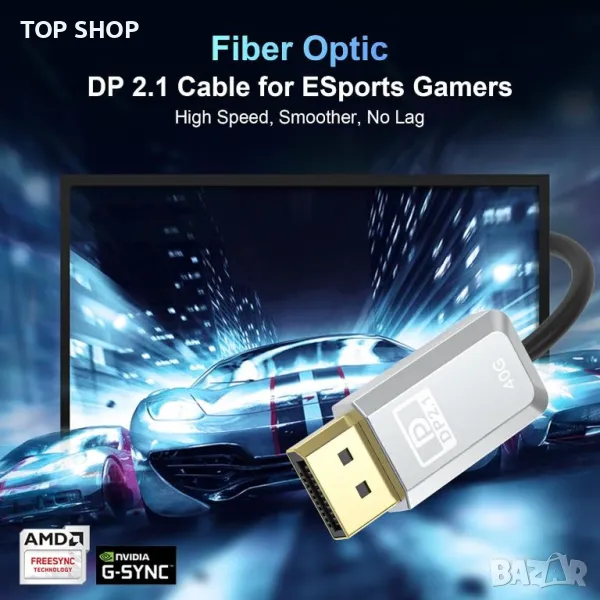 DisplayPort 2.1 оптичен кабел, осигуряващ предаване на дълги разстояния без загуба и имунитет към електромагнитни смущения за стабилен, високоскоростен трансфер на данни, осигуряващ печелившо игрово изживяване. Съвместим с FreeSync и G-Sync, той поддържа 3D, HDR, HBR20, HDCP 2.2, Dynamic HDR, DSC1.2a, UHBR10, ALLM и VRR, с предаване на 32-bit/1536kHz аудио канал. Създаден за ентусиасти играчи на електронни спортове, включващ четириядрено оптично влакно, вътрешно екраниране, дизайн без резе и 24K позлатен конектор за издръжливост. Съвместим с DisplayPort 2.0/1.4/1.3/1.2/1.2A/1.1/1.0 и популярни графични карти за игри като