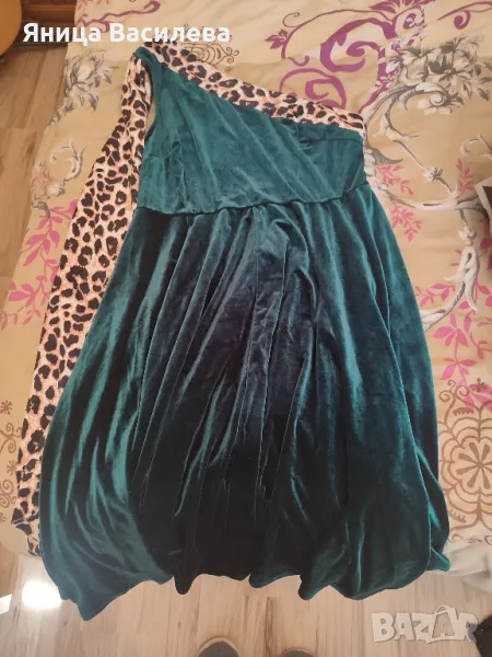 Зелена рокля изработена от висококачествено кадифе със силна еластичност. От рамото е спуснат леопардов акцент. В областта на деколтето и гърба е поставен кант в същия десен. Областта на ханша е силно разкроена. Закопчаването е странично със скрит цип. Размер 2хл