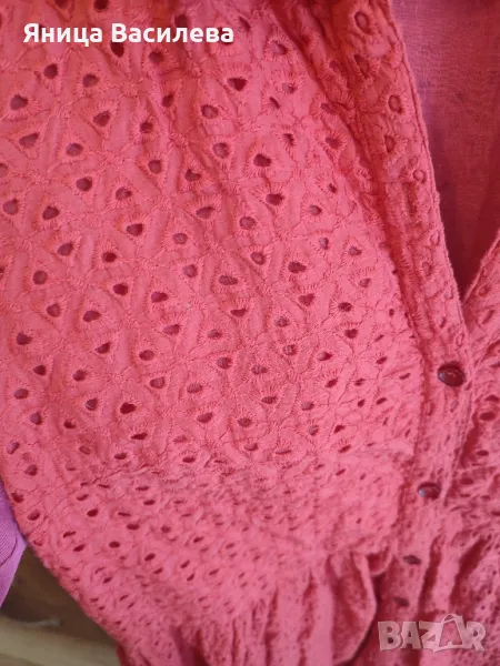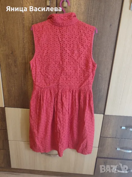 Лятна рокля до коляното в червен цвят. Шарката е много интересна, като бродирани цветя. Не прозира и дупчиците не са отворени, т.е те са само за ефекта и под тях има нещо, като подплата.