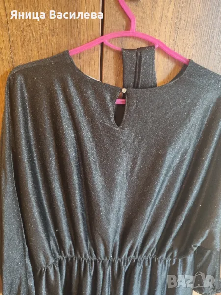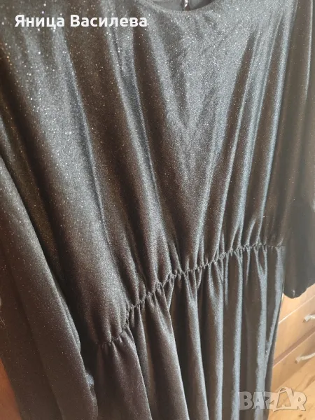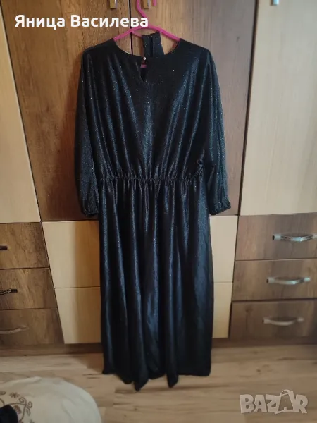 Дълга рокля тип бална в черен цвят обсипана с брокат. Подходяща за вечерно излизане или официално събитие. Има коланче, което се маха и може да бъде носена със или без него. Има ластик на талията. Продавам я защото вече ми е много голяма.