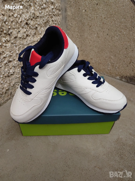 Бели маратонки с тъмносини и червени акценти. Маратонките са от изкуствена кожа, номер 36. Подходящи са и за дете.