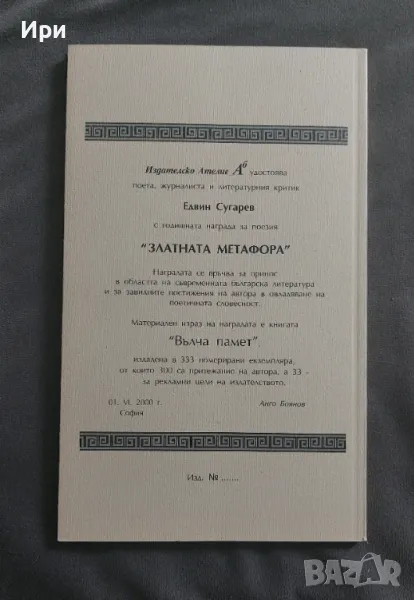 Издателско ателие "Аб" удостоява поета, журналиста и литературния критик Едвин Сугарев с годишната награда за поезия "Златна метафора". Наградата се връчва за принос в областта на съвременната българска литература и за завидните постижения на автора в овладяване на поетичната словесност. Материален израз на наградата е книгата "Вълча памет", издадена в 333 номерирани екземпляра, от които 300 са притежание на автора, а 33 - за рекламни цели на издателството.