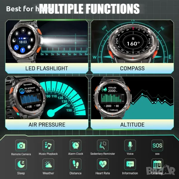 【Подходящ за дейности на открито】 - Мъжкият смарт часовник LaNikar е оборудван с ярко LED фенерче отстрани и вградена батерия с голям капацитет от 530 mAh, за да се осигури живот на батерията и вече да не се тревожите за пътуване на тъмно! Умният часовник разполага и с функции за компас, надморска височина и барометър, които ви позволяват да следите посоката, надморската височина и атмосферното налягане в реално време на открито, което ви позволява смело да изследвате света!