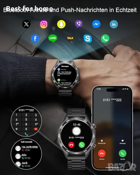 Bluetooth обаждане и известяване: безпроблемно се свържете с вашия телефон чрез Bluetooth за обаждания и известия на китката ви, за да сте сигурни, че ще останете свързани, без да пропускате важни съобщения (WhatsApp, Instagram, Twitter и др.)