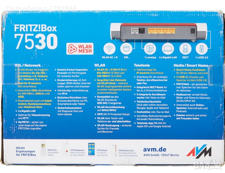 ФРИЦ! Box 7530 е идеално въведение към бърза домашна мрежа със супервектор 35b. Заедно с ADSL / VDSL модем и безжичен рутер в едно устройство, FRITZ! Box 7530 разполага и с интегрирана DECT телефонна система, както и USB порт и медиен сървър. Открийте FRITZ! OS, която прави вашата домашна мрежа по-удобна, по-проста и по-сигурна от всякога.