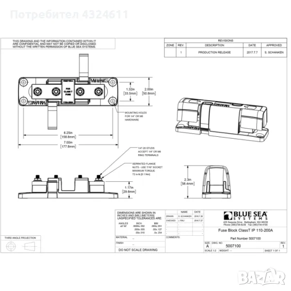 Blue Sea 5007100 Marine Class T, предпазителен блок с изолационен капак, 110 до 200A