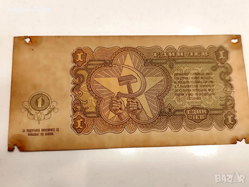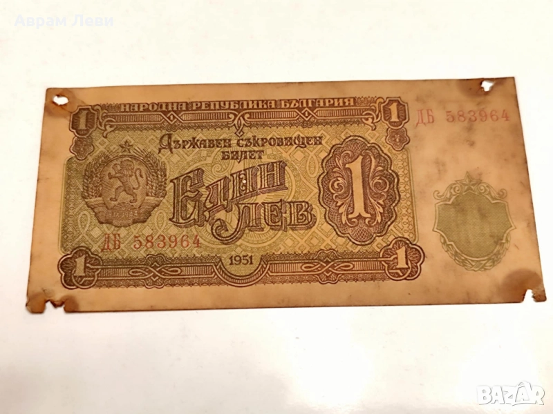 Банкнотата от 1 лев 1951 г. е с леки следи от времето, но рядка и ценна част от лота.