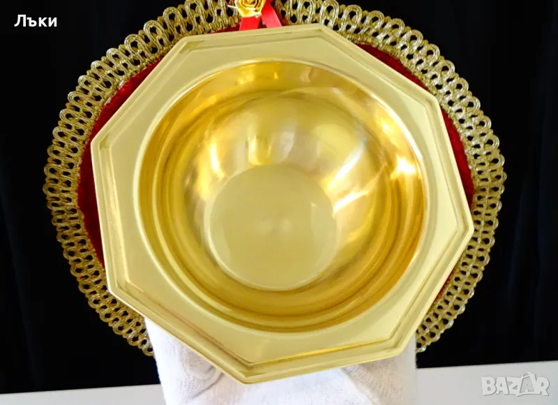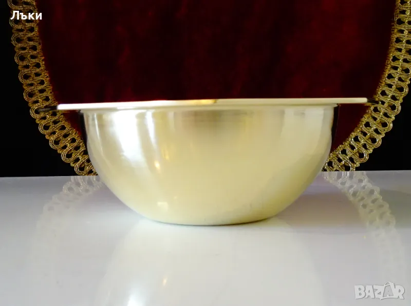 от масивен високо качествен бронз със златен блясък.Има удобна периферия с многостенен профил октагон.Височина 5 см.,диаметър 15 см.,тегло 340 гр.Вместимост 450 мл.